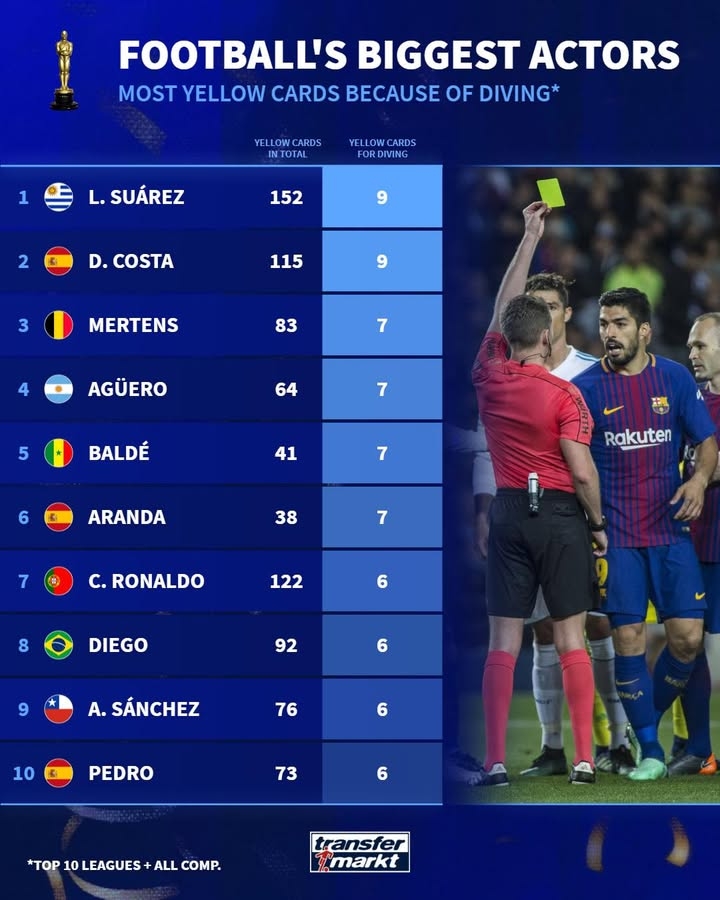 足球数据库-德转列前10联赛假摔染黄次数榜:苏牙&科斯塔9黄第一,C罗6黄上榜