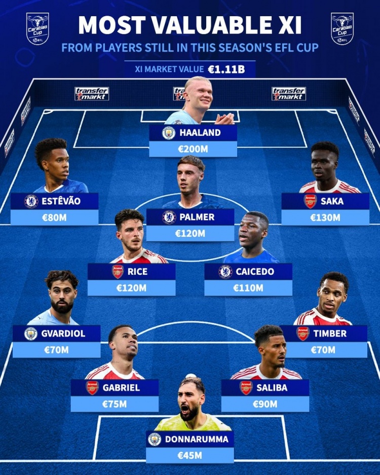 1月13日讯 足总杯第3轮已经完赛,《转会市场》也列出了仍未出局的球员最贵阵,阿森纳5将在列、切尔西曼城各3人。足总杯仍未出局最贵阵:总身价11.1欧元前锋:埃斯特旺(切尔西,8000万)、哈兰德(曼城,2亿)、萨卡(阿森纳,1.3亿)中场:赖斯(阿森纳,1.2亿)、帕尔默(切尔西,1.2...